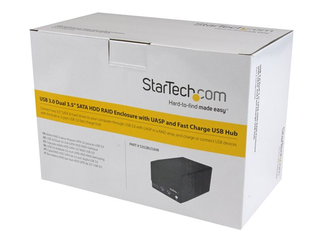 Le boîtier RAID à deux baies S352BU33HR vous permet de constituer une matrice RAID externe avec deux disques durs SATA 3,5 pouces et de la brancher à votre ordinateur par le biais d'un port USB 3.0.