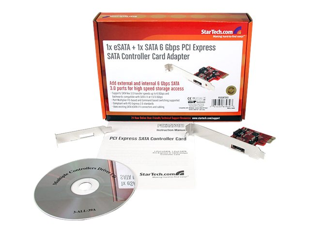 StarTech.com Adaptateur de carte contrôleur SATA PCI Express 1x eSATA + 1x SATA 6 Gbps - Contrôleur de stockage (RAID) - SATA 6Gb/s / eSATA 6Gb/s - profil bas - RAID RAID 0, 1, JBOD - PCIe 2.0 x1 - rouge - pour P/N: S251SMU33EP, S3520BU33ER, S355BU33ERM, ST521PMINT