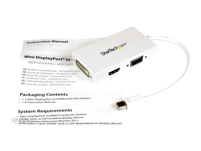 StarTech.com Adaptateur de voyage Mini DisplayPort vers DVI / VGA / HDMI pour MacBook - Convertisseur vidéo 3-en-1 - Blanc - Convertisseur vidéo - DisplayPort - DVI, HDMI, VGA - blanc - pour Apple MacBook Air MDP2VGDVHDW