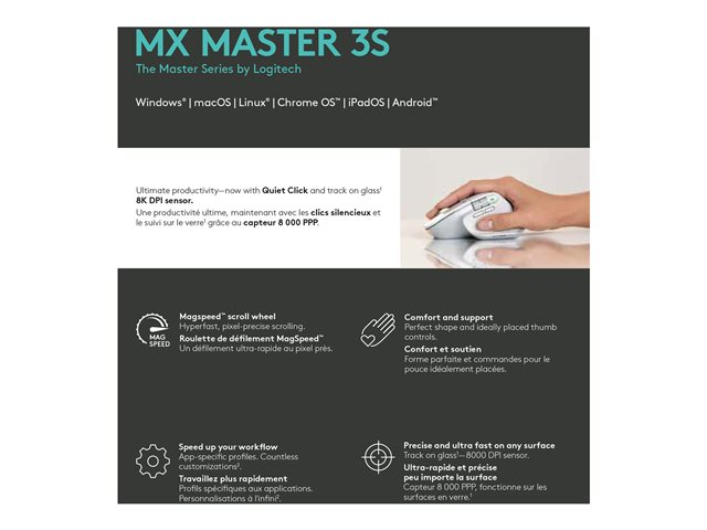 Logitech Master Series MX Master 3S - Souris - ergonomique - optique - 7 boutons - sans fil - Bluetooth, 2.4 GHz - récepteur USB Logitech Logi Bolt - gris pâle