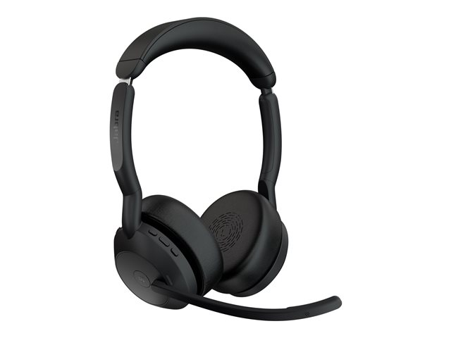 Jabra Evolve2 55 MS Stereo - Micro-casque - sur-oreille - Bluetooth - sans fil - Suppresseur de bruit actif - USB-A - noir - avec support de chargement - certifié Zoom, Cisco Webex Certified, Optimisé pour Microsoft Teams, Certifié Alcatel-Lucent, Certifié Avaya, Certifié Unify, Certifié MFi, Certifié Amazon Chime