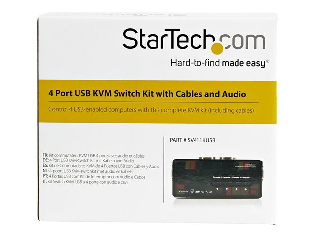 Le kit commutateur KVM USB SV411KUSB 4 ports avec audio et câbles vous permet de commander quatre ordinateurs dotés de ports USB à l'aide d'un seul ensemble clavier, souris et moniteur VGA ; il permet également le fonctionnement par touche directe et par bouton poussoir situé sur le panneau supérieur pour basculer entre les écrans connectés. Conçu pour une intégration parfaite dans tous les environnements, le commutateur KVM USB offre une conception compacte (environ la taille d'un jeu de cartes) ; il est alimenté par les ordinateurs auxquels il est connecté, supprimant ainsi la nécessité d'une alimentation externe. Le commutateur KVM USB est une solution idéale pour quasiment toutes les applications, il prend en charge des résolutions vidéo d'au plus 4048 x 1536 ainsi que la commutation audio. Le commutateur KVM USB inclut deux câbles hôte VGA et USB 4-en-un de 1,22 mètre, pour une installation rapide ; il offre une solution KVM prête à l'emploi. Le commutateur KVM permet un contrôle pratique et fiable de plusieurs ordinateurs à partir d'une seule station périphérique, il est accompagné d'une garantie StarTech.com de 2-ans et d'une assistance technique gratuite à vie.