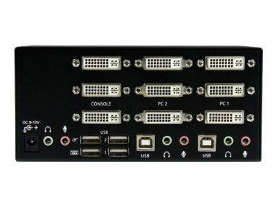 Le commutateur KVM USB DVI trois écrans 2 ports SV231TDVIUA permet à 2 ordinateurs (comprenant chacun 3 sorties vidéo DVI) de partager des écrans, 1 microphone et 1 jeu de haut-parleurs, 1 clavier et 1 souris, ainsi qu'un périphérique USB 2.0 supplémentaire, comme un disque dur, une clé USB, une imprimante ou une webcam.