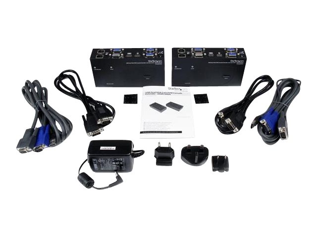 L'extendeur KVM double VGA sur Cat5 prend en charge les boutons poussoirs et les raccourcis clavier d'utilisation facile, qui vous permettent de permuter entre les systèmes connectés localement et à distance, alors que les branchements de console aux deux extrémités de votre configuration offrent un accès facile à tous les systèmes connectés aux deux endroits. Les raccourcis clavier permettent également de régler la vidéo pour optimiser la qualité de l'image sur diverses distances. L'extension sur deux câbles standard Cat5 (ou plus) vous permet d'utiliser le câblage existant afin d'assurer l'accès à distance à votre serveur ou à votre commutateur KVM.